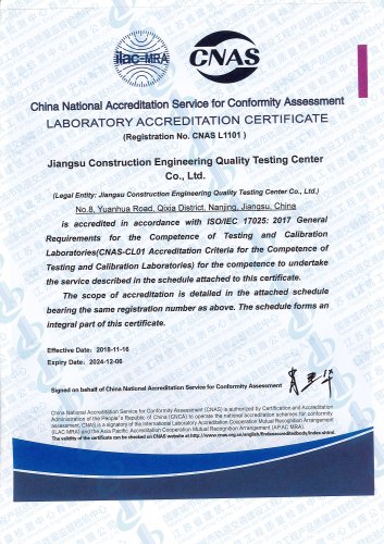 國家城市軌道交通建設工程產品質量監(jiān)督檢驗中心, 依托江蘇省建筑科學研究院和江蘇省建筑工程質量檢測中心在城市軌道交通建設工程領域的綜合技術優(yōu)勢,于2016年10月獲得國家認證認可監(jiān)督委員會批準授權..